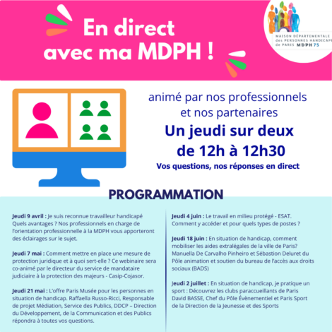 Pour mieux vous informer et répondre à vos préoccupations, la MDPHMDPH Maison Départementale des Personnes Handicapées de Paris propose des webinaires courts de 30 minutes, accessibles à tous et animés par nos professionnels et nos partenaires.